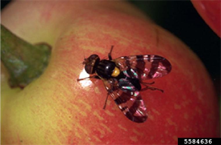 Adults typically emerge from May to July and have an average lifespan of 2 to 4 weeks. Females usually lay one egg beneath the skin of each piece of fruit. Once they hatch from the eggs, the larvae develop inside the fruit and feed for up to 6 weeks. As the larvae develop, they damage the fruit pulp. Mature larvae exit the fruit through emergence holes, drop to the ground, and burrow into the soil. Once in the soil, they pupate within a few days and overwinter in the soil underneath or near the host plant.